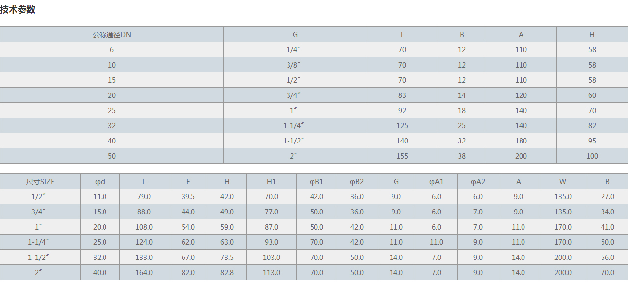 | 尺寸SIZE | φd | L | F | H | H1 | φB1 | φB2 | G | φA1 | φA2 | A | W | B |