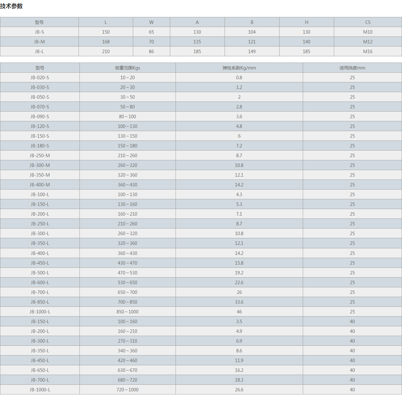 | 型號 | 荷重范圍Kgs | 彈性系數Kg/mm | 適用撓度mm |