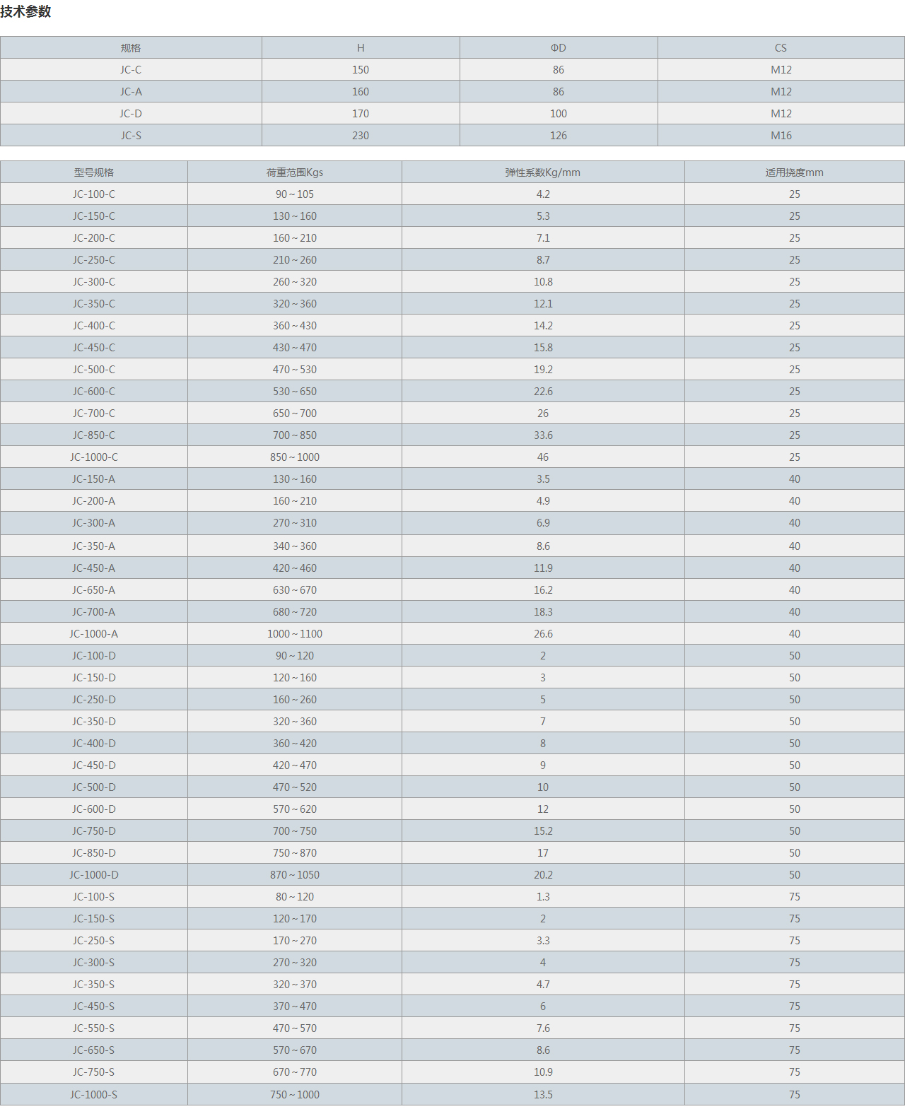 型號規格 荷重范圍(Kg) 彈性系數(Kg/mm) 適用撓度(mm)
