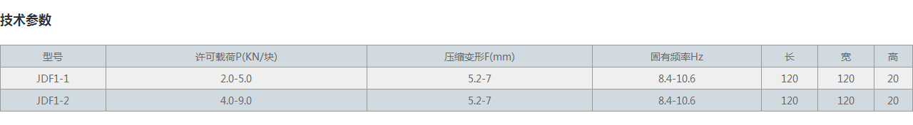 | 型號 | 許可載荷P(KN/塊) | 壓縮變形F(mm) | 固有頻率Hz | 長 | 寬 | 高 |
