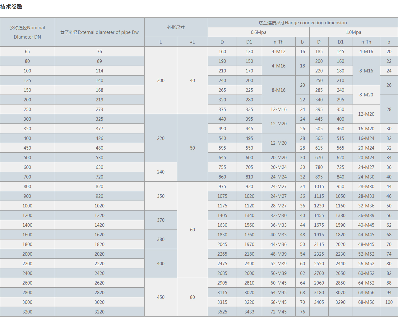 公稱通徑Nominal Diameter DN 管子外徑External diameter of pipe Dw 外形尺寸 法蘭連接尺寸Flange connecting dimension