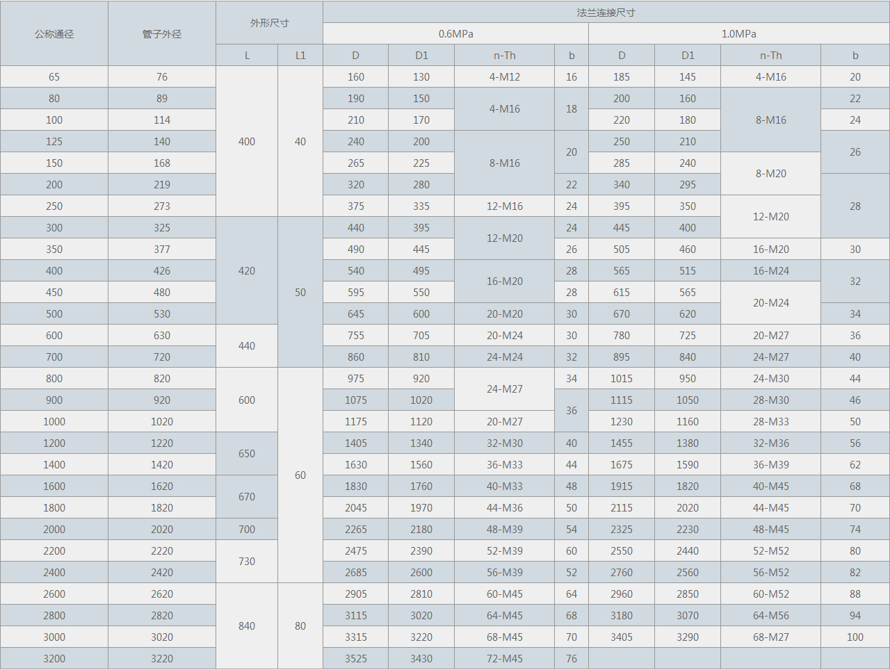 公稱通徑 管子外徑 外形尺寸 法蘭連接尺寸
