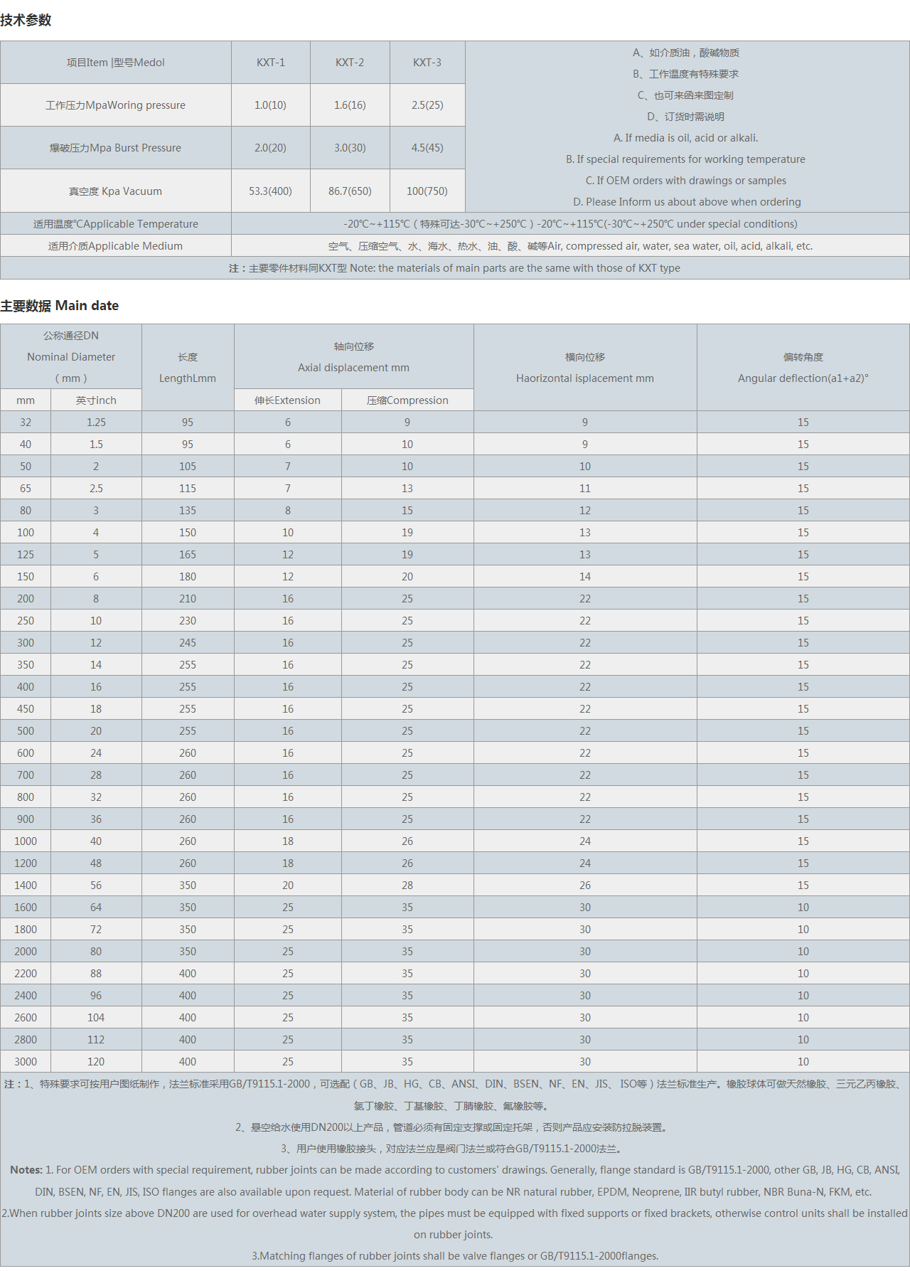 | 注:1、特殊要求可按用戶圖紙制作,可選配(GB、JB、HG、CB、ANSI、DIN、BSEN、NF、EN、JIS、 等)法蘭標準生產。橡膠球體可做天然橡膠、三元乙丙橡膠、氯丁橡膠、丁基橡膠、丁腈橡膠、氟橡膠等。 2、懸空給水使用DN200以上產品,管道必須有固定支撐或固定托架,否則產品應安裝防拉脫裝置。 3、用戶使用橡膠接頭,對應法蘭應是閥門法蘭。 Notes: 1. For OEM orders with special requirement, rubber joints can be made according to customers' drawings. Generally, flange standard is , other GB, JB, HG, CB, ANSI, DIN, BSEN, NF, EN, JIS, flanges are also available upon request. Material of rubber body can be NR natural rubber, EPDM, Neoprene, IIR butyl rubber, NBR Buna-N, FKM, etc. 2.When rubber joints size above DN200 are used for overhead water supply system, the pipes must be equipped with fixed supports or fixed brackets, otherwise control units shall be installed on rubber joints. 3.Matching flanges of rubber joints shall be valve flanges or flanges. |