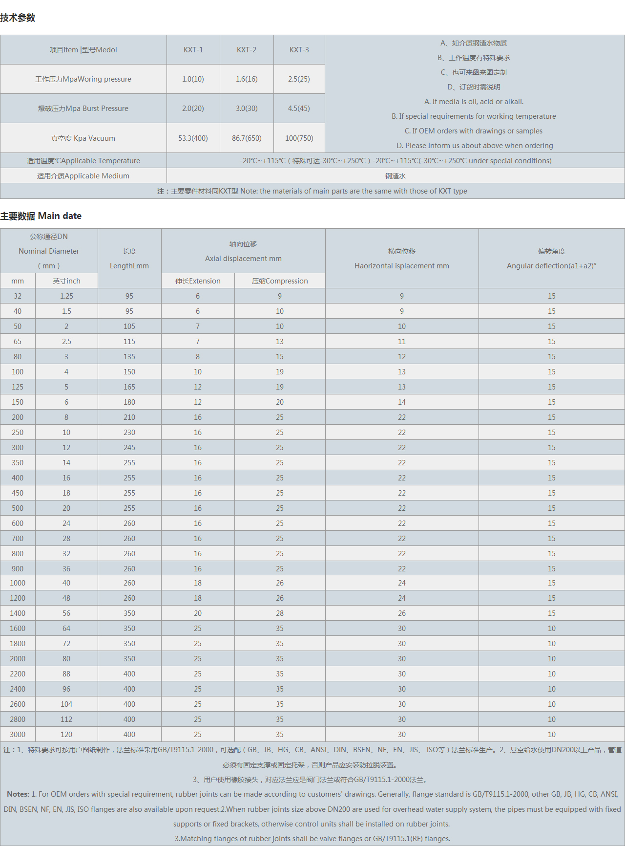 Notes:1. For OEM orders with special requirement, rubber joints can be made according to customers' drawings. Generally, flange standard is , other GB, JB, HG, CB, ANSI, DIN, BSEN, NF, EN, JIS, flanges are also available upon request. 2.When rubber joints size above DN200 are used for overhead water supply system, the pipes must be equipped with fixed supports or fixed brackets, otherwise control units shall be installed on rubber joints.