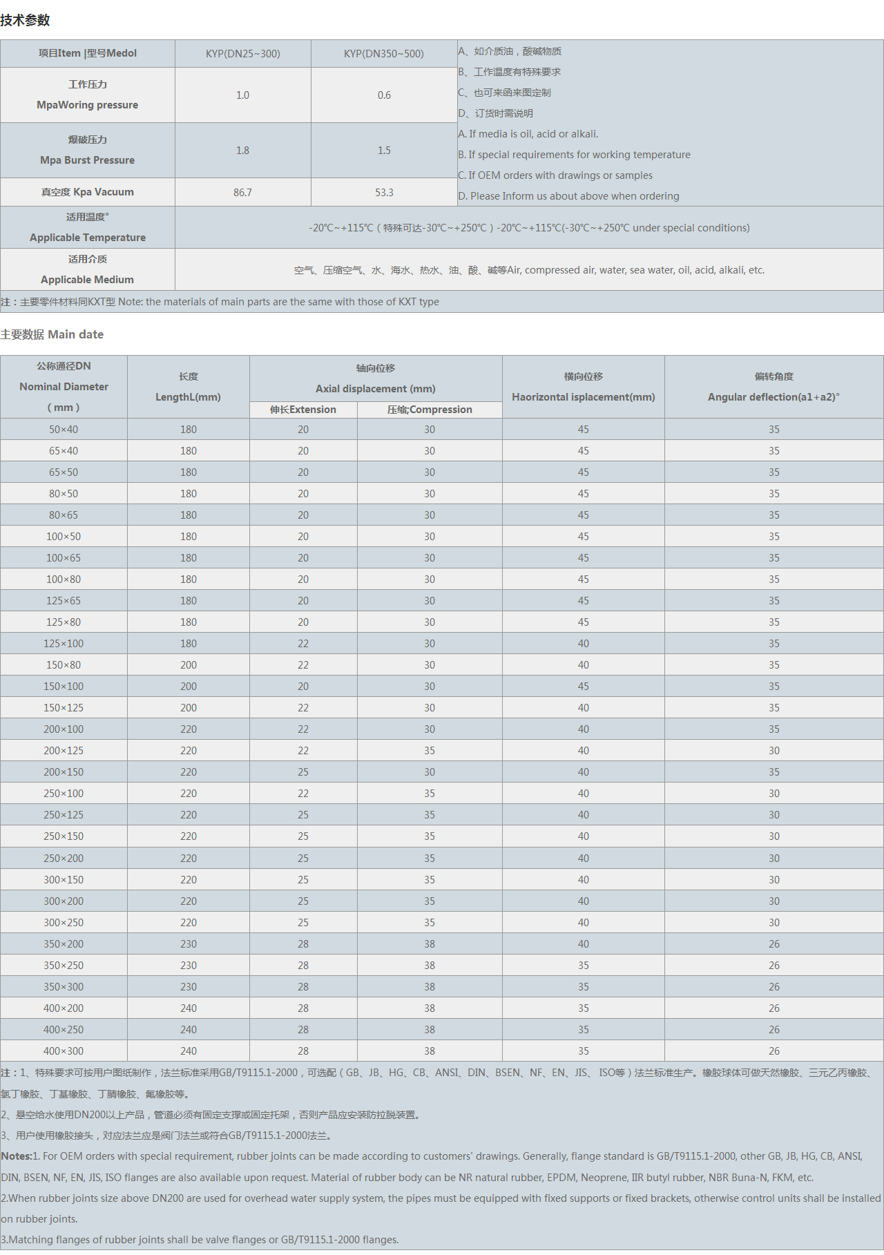 Notes:1. For OEM orders with special requirement, rubber joints can be made according to customers' drawings. Generally, flange standard is , other GB, JB, HG, CB, ANSI, DIN, BSEN, NF, EN, JIS, flanges are also available upon request. Material of rubber body can be NR natural rubber, EPDM, Neoprene, IIR butyl rubber, NBR Buna-N, FKM, etc.